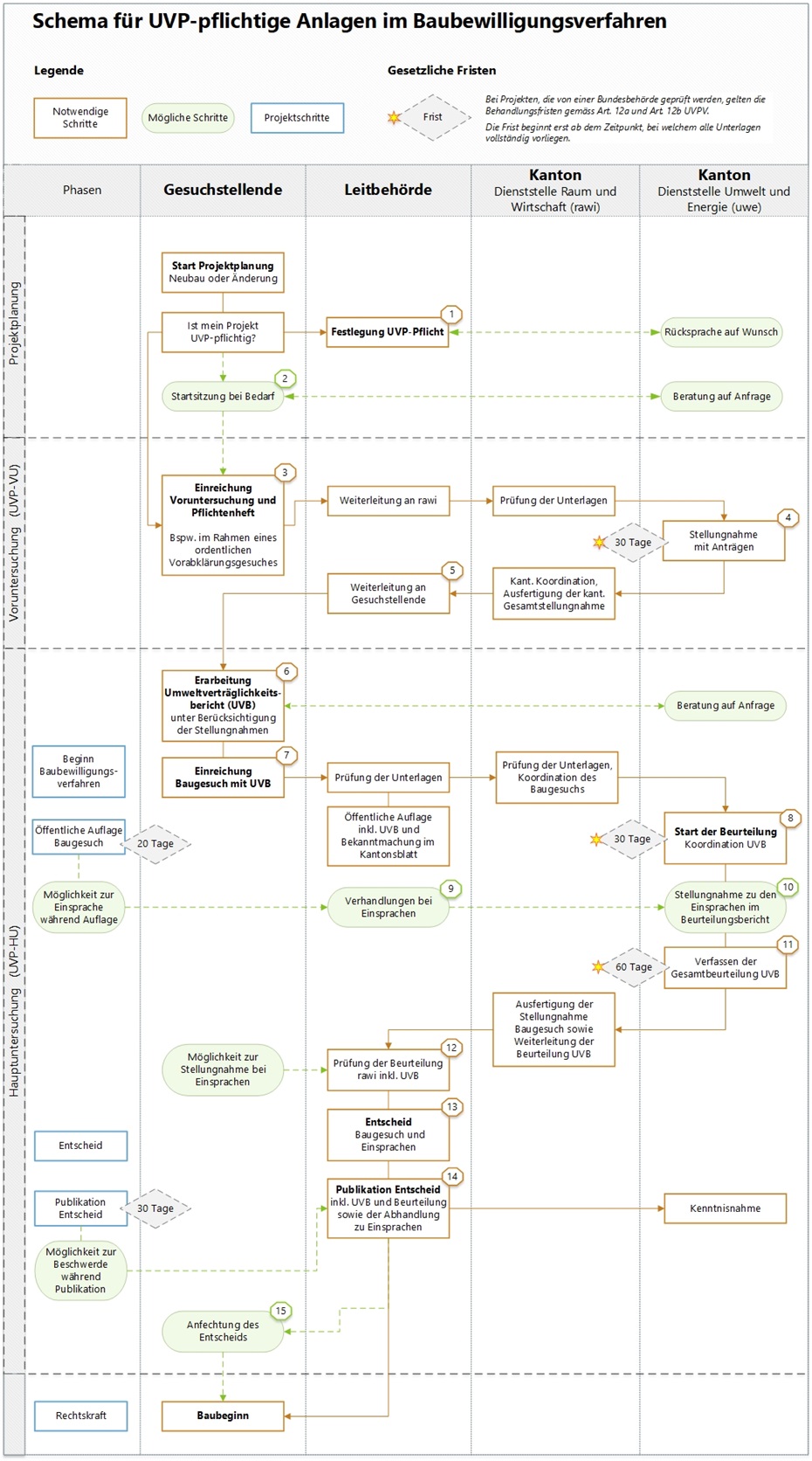 Die zuständige Behörde prüft, ggf. nach Rücksprache mit der Dienststelle Umwelt und Energie (DS uwe), die UVP-Pflicht und das massgebliche Verfahren.