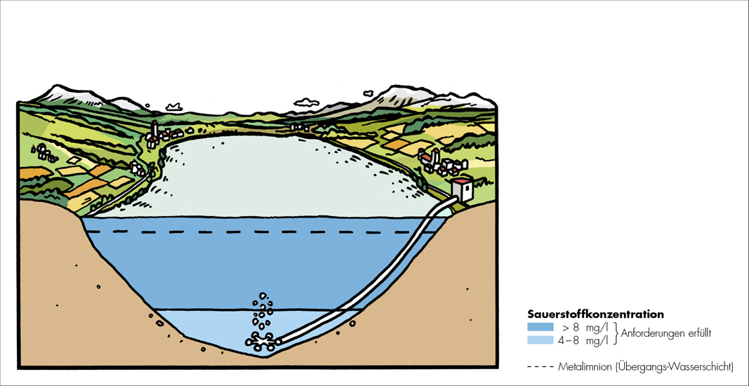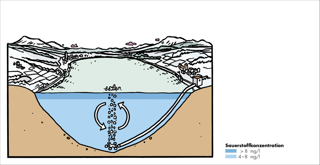 Der seit 1965 festgestellte Anstieg der Phosphorkonzentration hat zu einem erheblichen Sauerstoffmangel im Tiefenwasser geführt. Seit Mitte der 1980er Jahre wird deshalb die natürliche Zirkulation des Sees im Winter mit Druckluft unterstützt (siehe Illustrationen). Im Sommer wurde vor 1997 Sauerstoff, seit 1997 wird Druckluft feinblasig ins Tiefenwasser eingetragen, mit dem Ziel, den Sauerstoffgehalt auf über 4 mg pro Liter im Tiefenwasser zu erhöhen (4 mg = gesetzlicher Grenzwert). Träger der Seesanierung ist der Gemeindeverband Sempachersee.