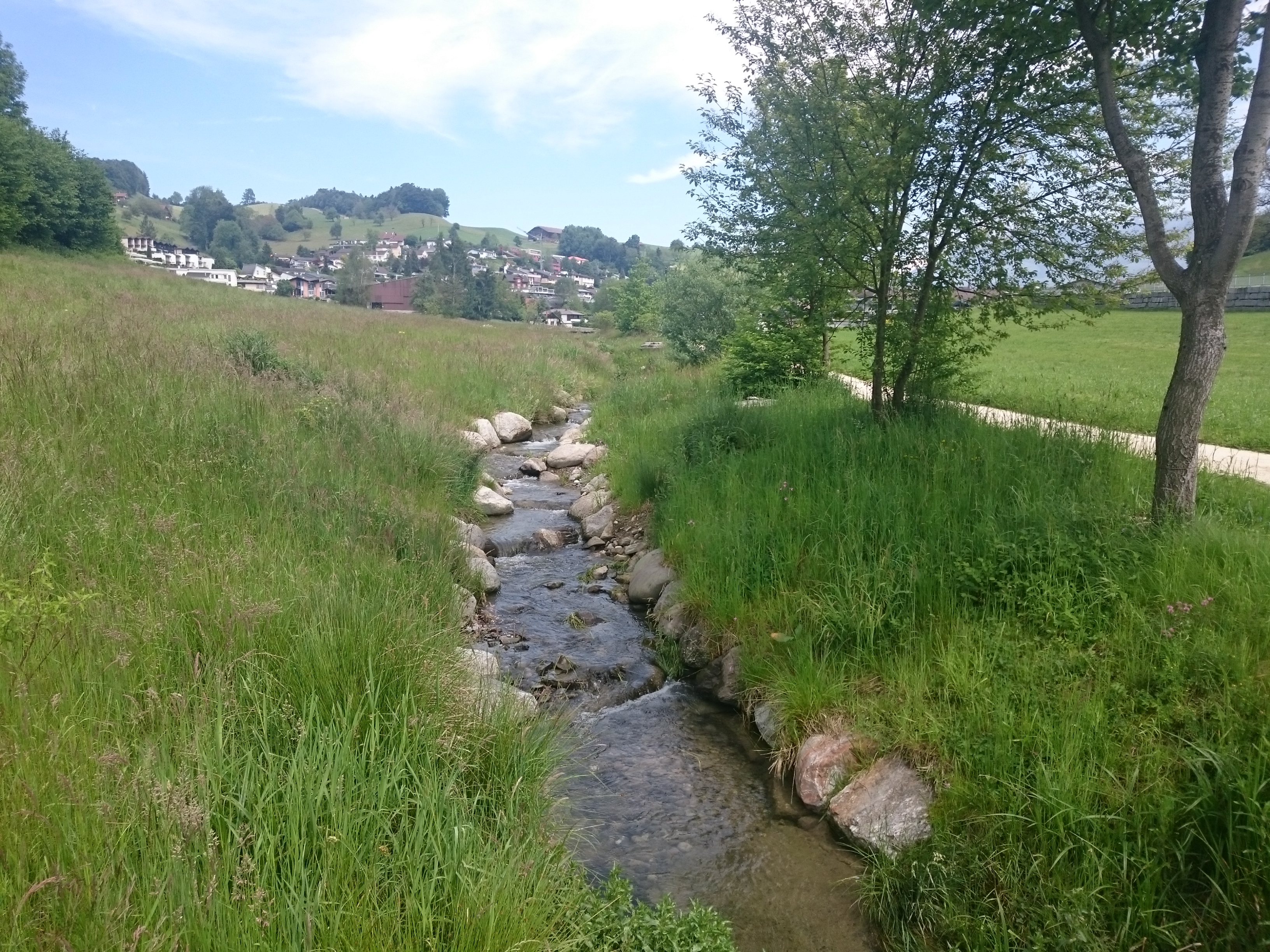 Der Lettenbach fliesst westlich von Adligenswil Richtung Ebikon. 2013 wurde der Abschnitt entlang des Spazierwegs am Dorfrand revitalisiert.